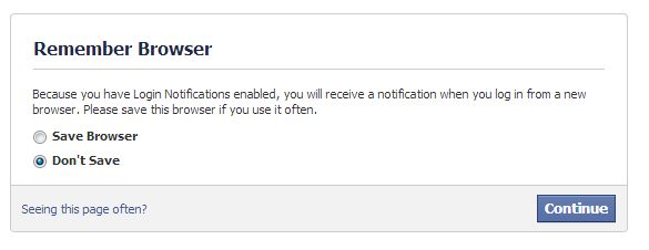* Login Notifications once enabled will cause Facebook to challenge you on each login. It isn’t complicated; just a “do you want to remember this browser” type of question. I ALWAYS say “do not remember,” that way my phone gets an email on every login. It is a simple way to let you know of access to your account and at the end of the day just delete those notices if they all are your logins.